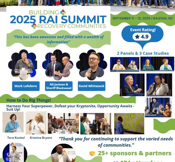 The 2025 RAI Building Recovery Communities Summit brought together over 170 leaders and advocates from 12 sectors across North Carolina for two days of connection, learning, and action in Raleigh. The event featured inspiring keynote speakers Mark Lefebvre and David Whitesock, dynamic panels, and powerful lived-experience case studies — all aimed at building stronger recovery communities. Together, we celebrated progress, shared innovative solutions, and strengthened our collective commitment to creating recovery-oriented communities across the state.